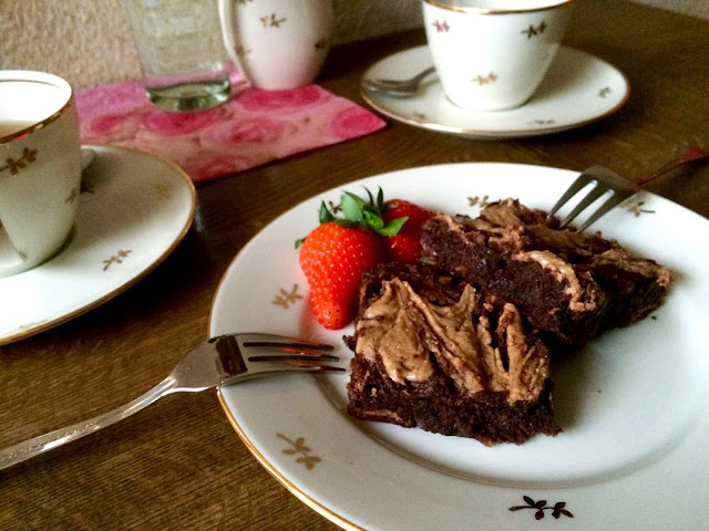 Ich möchte euch nur kurz zeigen, was bei uns zum gemeinsamen Tratsch am Muttertag auf der Kaffeetafel steht. Diesmal gibt es keine spektakuläre Torte, sondern eher einen „gesunden“ und trotzdem total leckeren Brownie mit Erdnussbutter. Denn meine Mum und ich backen zwar beide leidenschaftlich gerne, den Kuchen essen dürfen aber meistens andere.